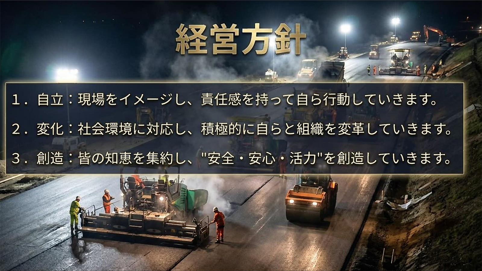 昭和40年代に高度経済成長に沿って起こされたモータリゼーションの波に乗って、道路建設が行われました。我々道路企画株式会社は、昭和50年前半に道路新設時代にそって道路関連物を建設する専門業者として設立しました。そして40年以上も前からある一つの価値観に沿って成長をしてまいりました。